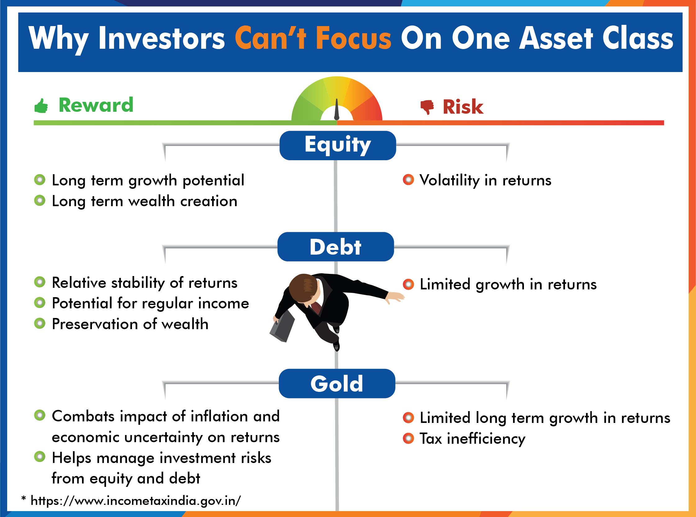 Each asset class such as equity, debt or gold, provide returns for a certain level of risk. For instance, if equities have potential for growth and long term wealth creation, their returns can be volatile too. While debt provides relative stability, there are limitations in the growth possibilities. On the other hand, while gold is helpful when economic and other conditions adversely impact debt and equity, it has limitations like tax inefficiency.